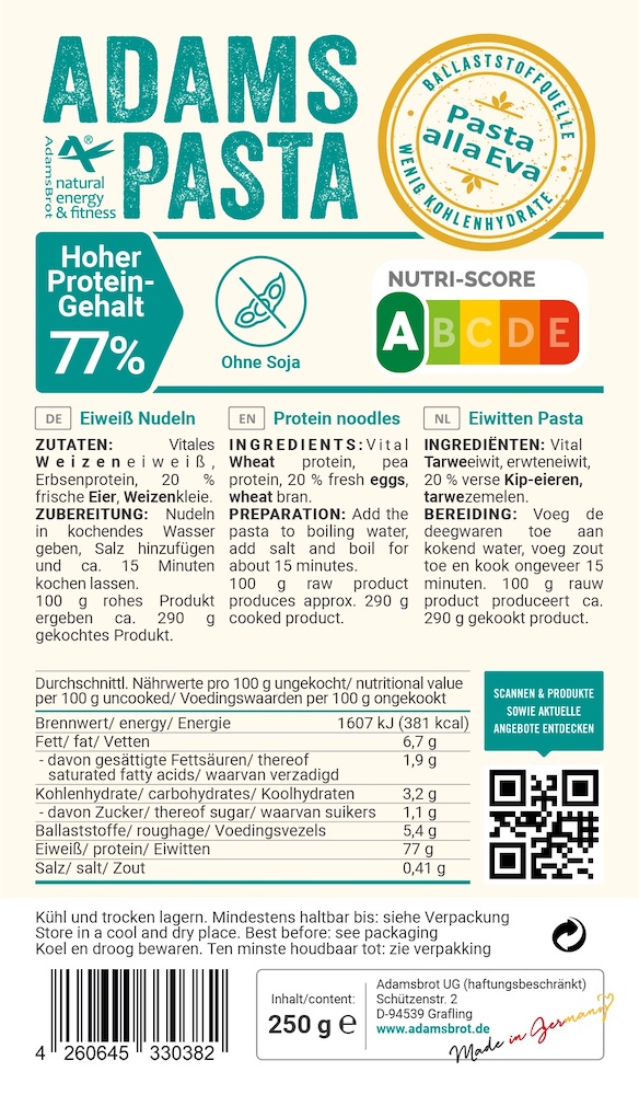 Adams Pasta Alla Eva om zelf een heerlijke pasta mee te bereiden dat past binnen een koolhydraatarm- en eiwitrijk dieet. De pasta bevat 77 gram eiwit per 100 gram pasta en daarentegen slechts 3,2 gram koolhydraten. Daarnaast bevat de pasta geen soja en is het geschikt voor