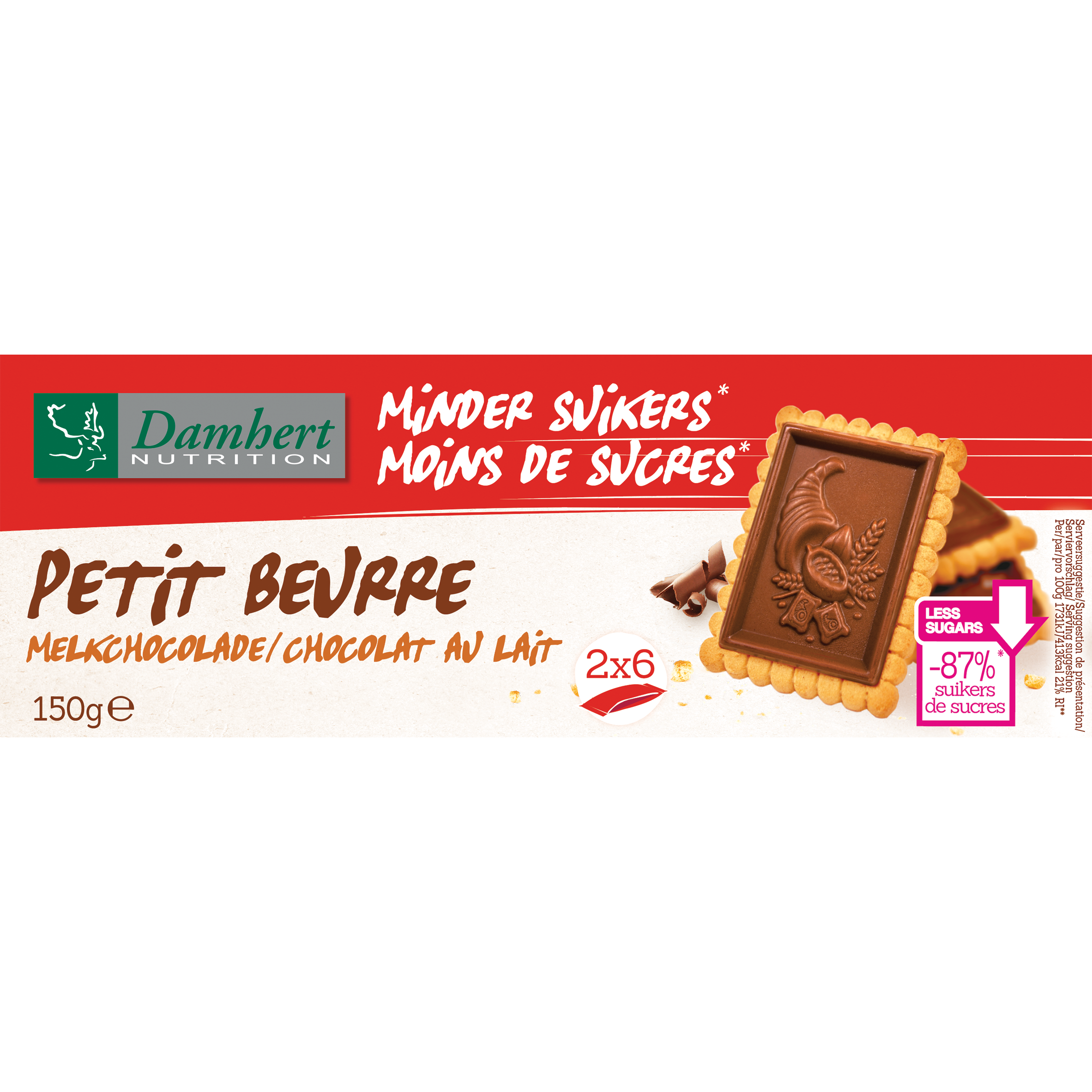 Damhert minder suikers Petit Beurre melkchocolade is een heerlijke snack voor tussendoor of bij de koffie. Deze koekjes zijn verlaagd in calorieën en koolhydraten en bevatten minder suiker dan reguliere Petit Beurre koekjes. De melkchocolade coating maakt ze extra lekker en