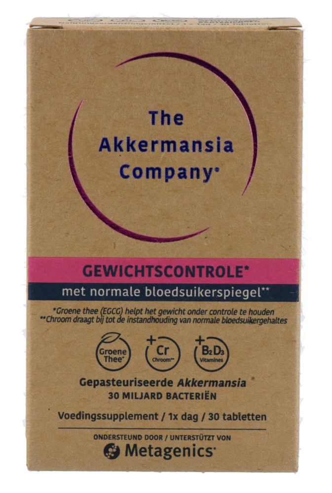 Metagenics Akkermansia Gewichtscontrole (30tb) bevat 30 miljard gepasteuriseerde akkermansia muciniphila, groene thee, chroom en vitamine B2 en D3. Metagenics Akkermansia Gewichtscontrole:Met Groenetheeblad-extractVitamine B2 en D3Bevat Akkermansia muciniphila in