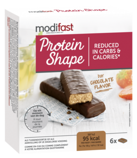 Modifast Protein Shape Reep Chocolate is een verantwoord tussendoortje. Deze snackreep heeft een heerlijke chocoladesmaak en een laagje pure chocolade eromheen. Dankzij de handige stuksverpakking zijn de repen gemakkelijk mee te nemen, zodat u ze altijd bij de hand